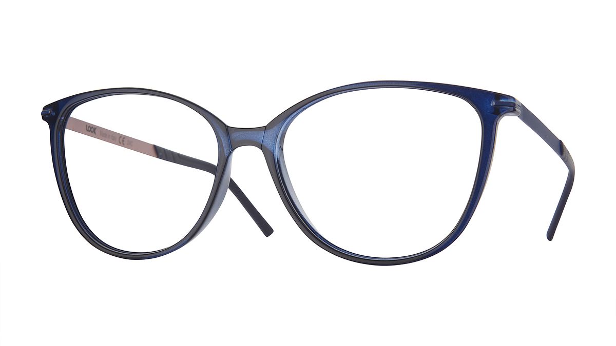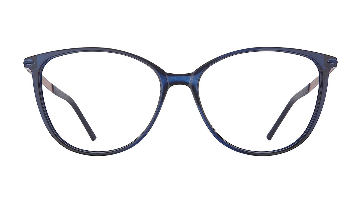 Farbe W7 - Glänzendes mitternachtsblaues Mittelteil. Bügel mit nachtblauer Außenseite und innen mauve-pink-metallic.