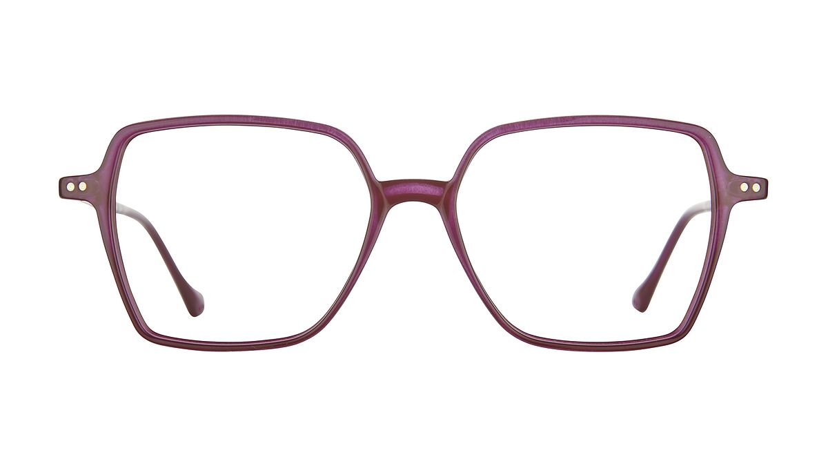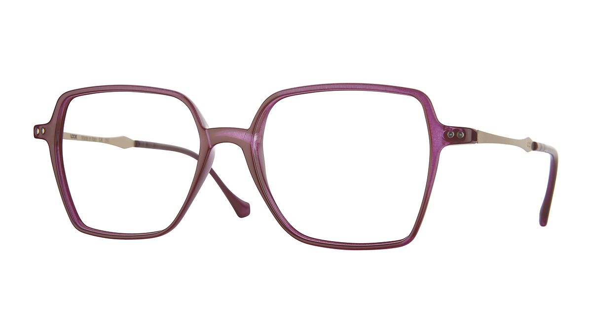 Farbe W6 - Glänzendes opalines pflaumenfarbenes Mittelteil, glänzende hellgoldene Bügel mit glänzenden opalinen pflaumenfarbenen Bügelenden.