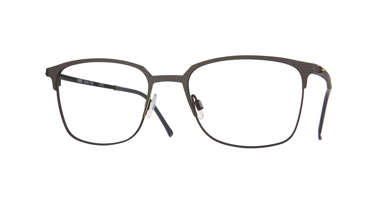Farbe M1 - Gunmetalgraue Front mit Textur, gelbe Oberprofile, mattschwarze Bügel und passende Endstücke.