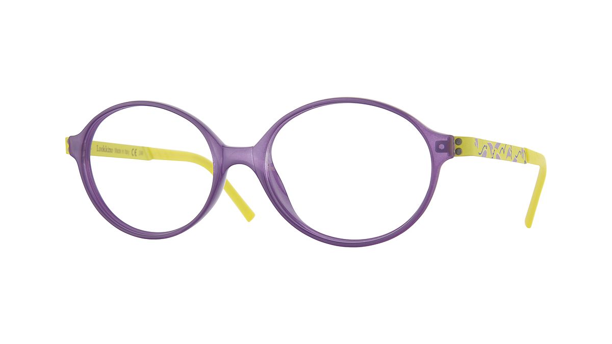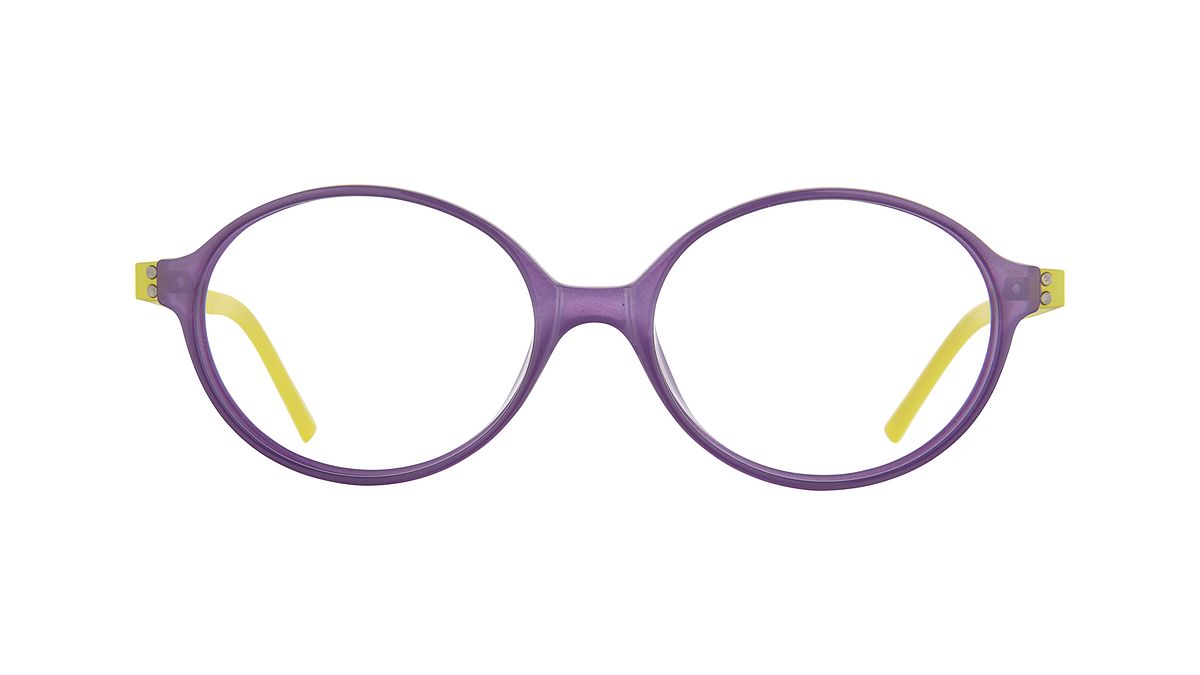 Farbe W25 - Glänzendes, halbtransparentes lila Mittelteil. Gelbe Bügel mit Herzblütenmuster.