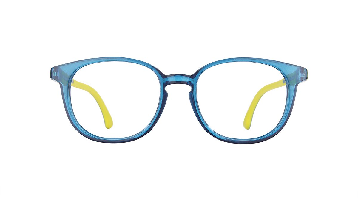 Farbe W4 - Intensiv transparentes, glänzendes himmelblaues Mittelteil. Matt hellblaue Bügel mit gelber Innenseite.