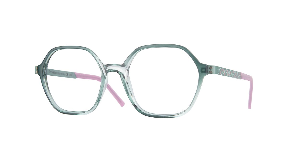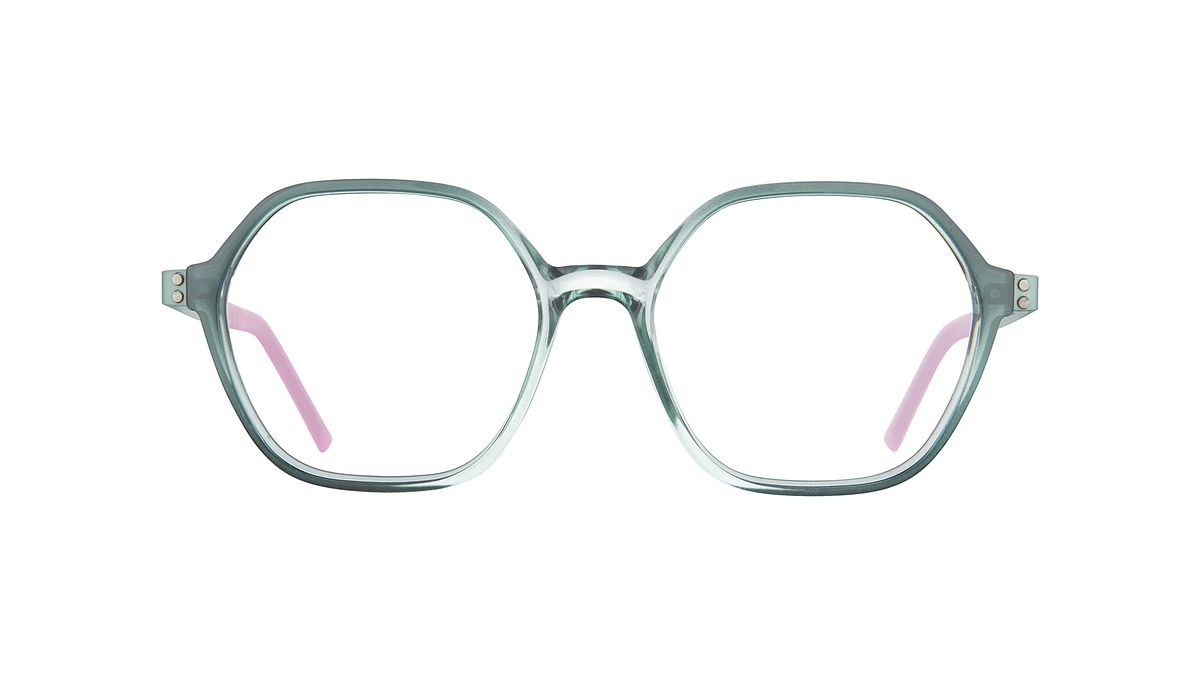 Farbe W7 - Glänzend transparenter, verlaufender aquamarinfarbener Mittelteil mit aquamarinfarbenen Bügeln mit weißen und rosa Herzmotiven.