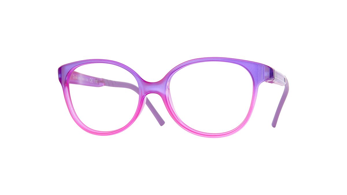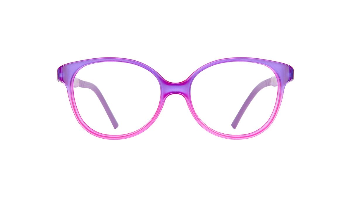 Farbe W3 - Transparentes Violett auf der Mittelteil, schattiert in glänzendem Fuchsia. Glänzende hellviolette Bügel mit einem nach unten gerichteten Geflecht und passenden hellvioletten Bügelende.