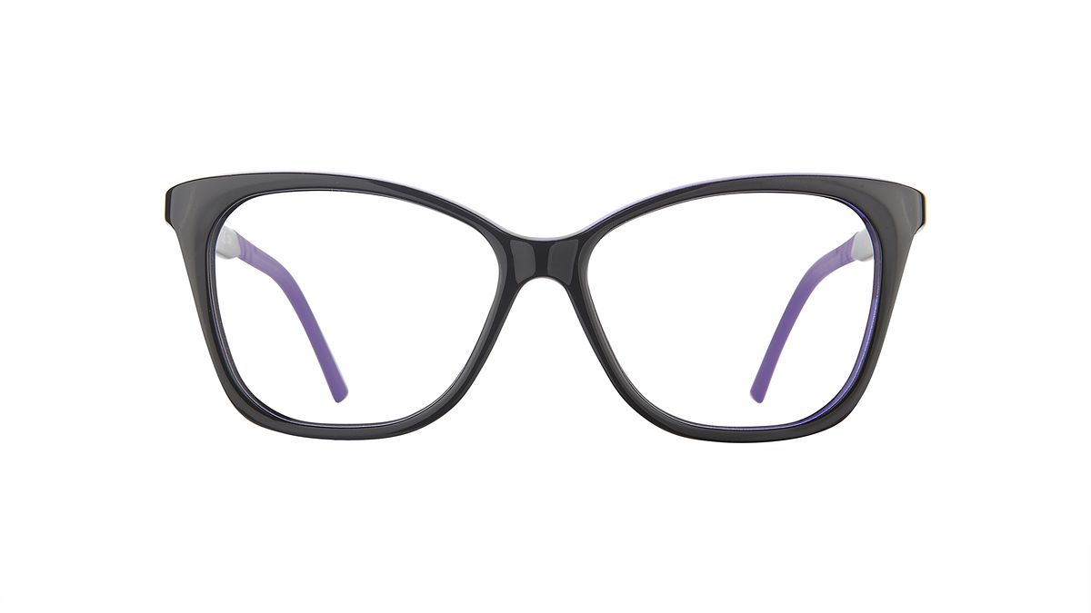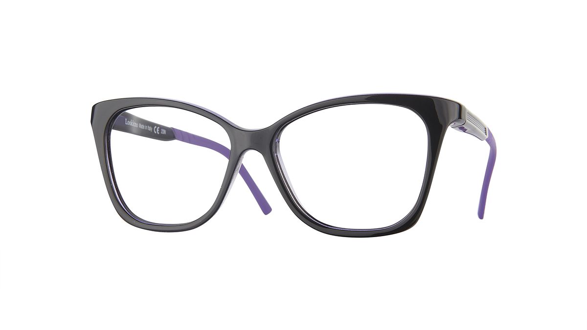 Farbe W1 - Glänzendes schwarzes Mittelteil und äußere Bügel. Glänzend transparent lila Innenseite und passende Bügelenden.