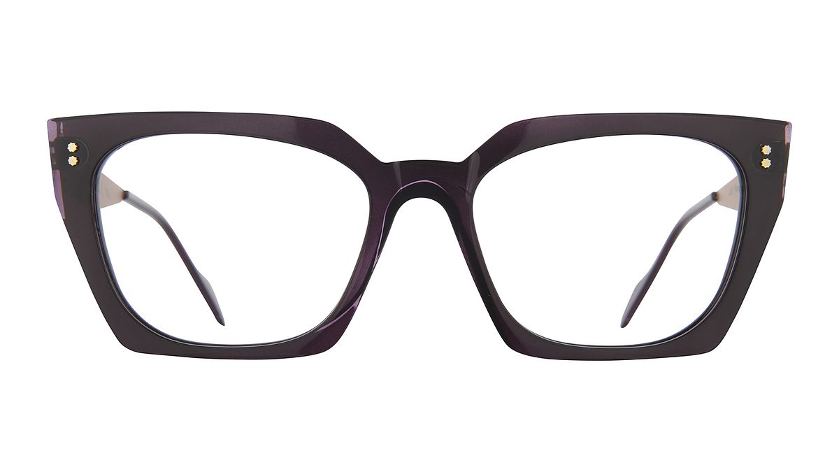 Coloration W1 - Dark purple front transparent black effect with matte rose gold temples. Transparent eggplant black temple-tips.