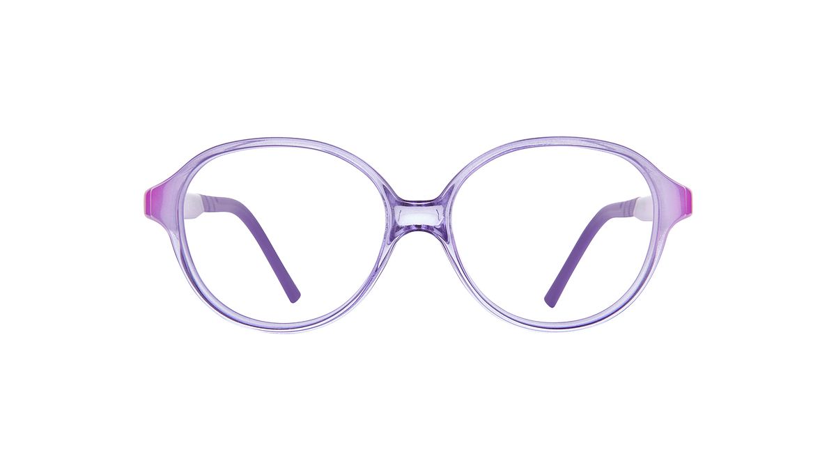 Coloration W4 - Glossy transparent wisteria front. Glossy light purple temples embellished with a downward weave and matching dark purple temple tips.