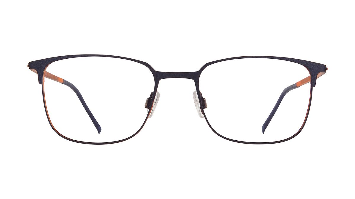 Colorear M4 - Frontal azul medianoche micáceo con interior naranja fluo metalizado. Patillas transparentes opacas con interior naranja fluorescente y exterior con rejilla touch color azul medianoche y terminales a juego.