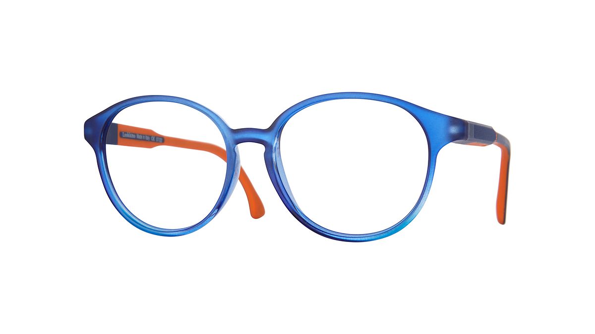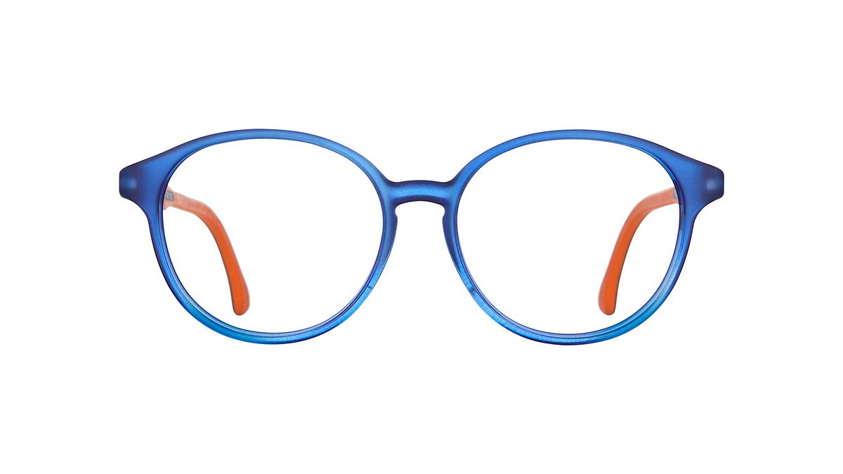 Colorear W4 - Frontal azul transparente opaco degradado transparente brillante. Patillas exteriores azul oscuro adornadas con textura en zig-zag e interior naranja.