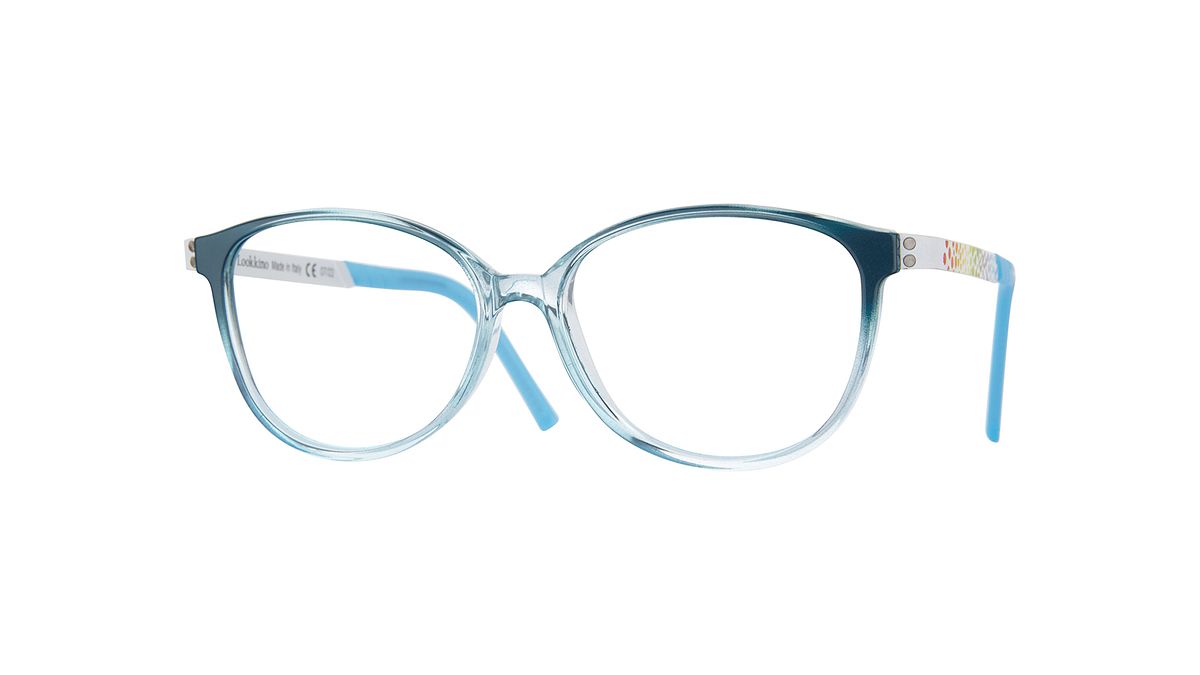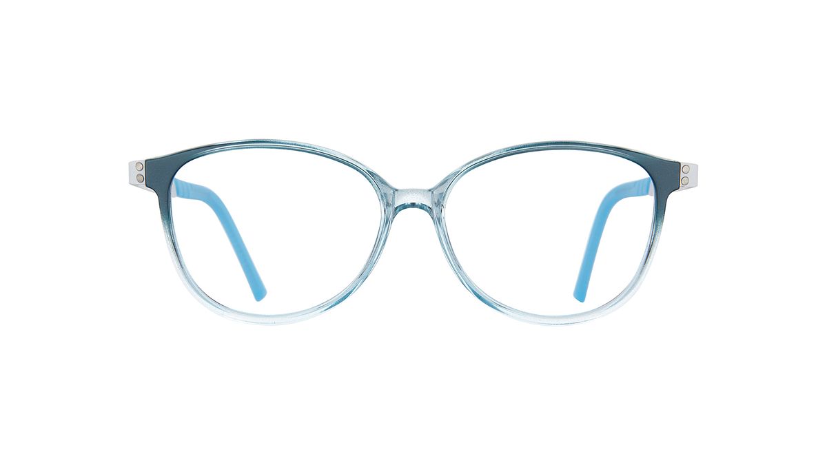 Couleur W13 - Face bleu transparent avec dégradé vert sarcelle sur les nez. Branches blanches avec détails touch-color à pois arc-en-ciel et bornes assorties.