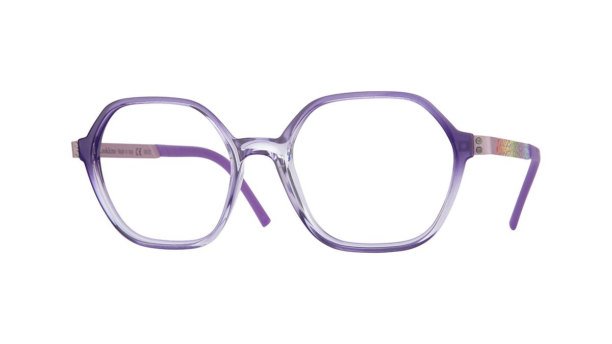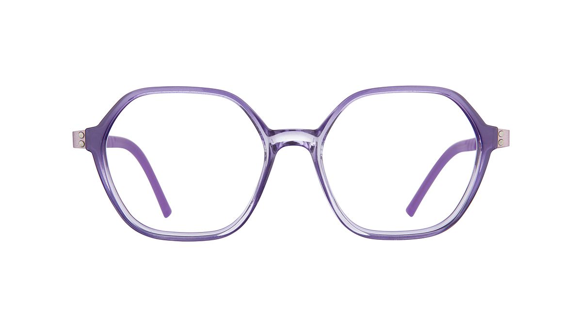 Couleur W1 - Face avant violette transparente et brillante, branches violettes glycines avec motif à pois arc-en-ciel et embouts assortis.