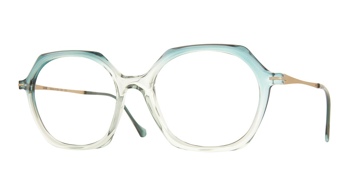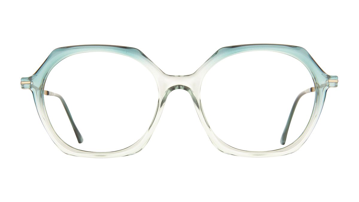 Colorazione W3 - Frontale verde acqua chiaro sfumato color ottanio trasparente lucido. Aste oro chiaro opaco. Terminale in abbinamento.