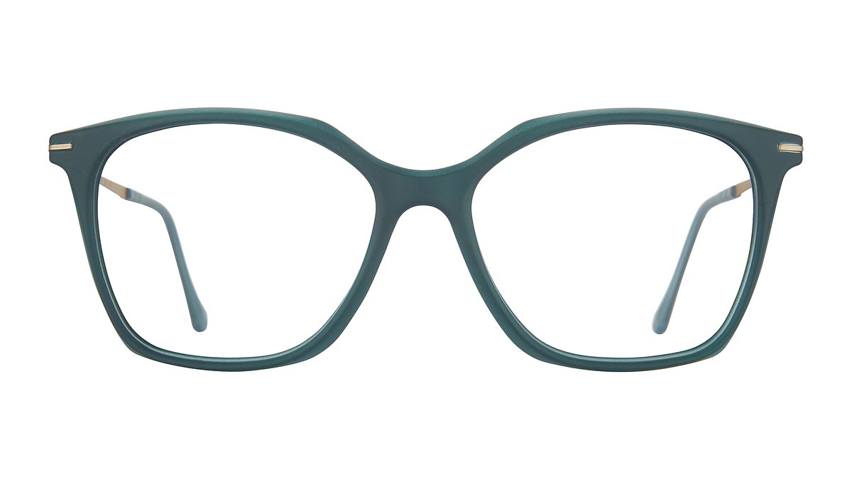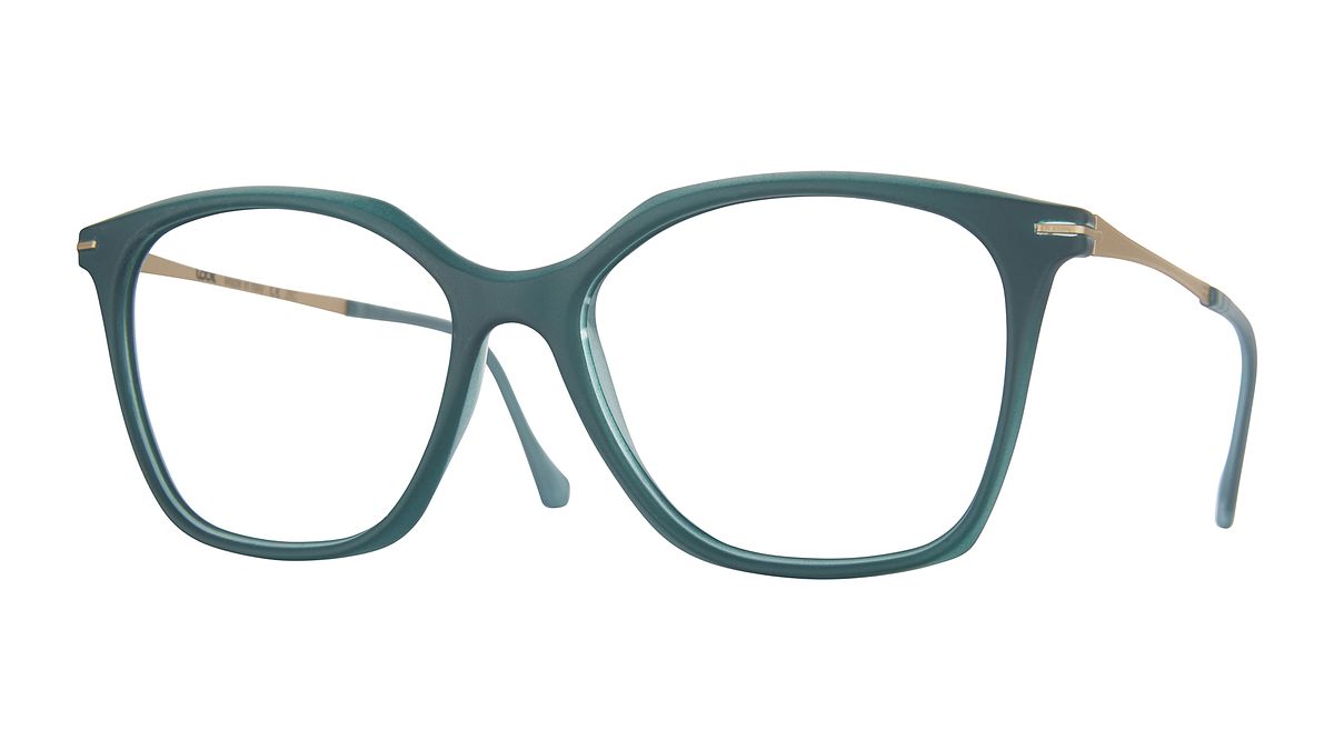 Colorazione W6 - Frontale verde bluastro opaco e lucido. Aste oro chiaro opache con terminali verde bluastro opalini opachi.