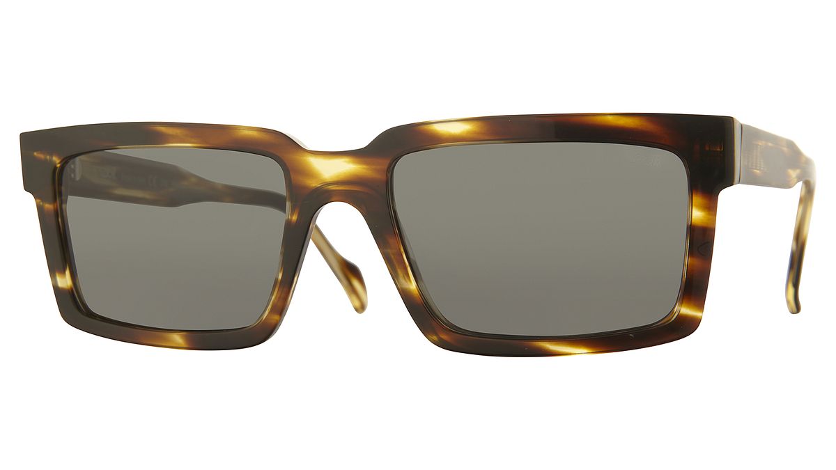 Colorazione C2S - Frontale e aste avana striata trasparente lucida. Lenti grigio scuro.