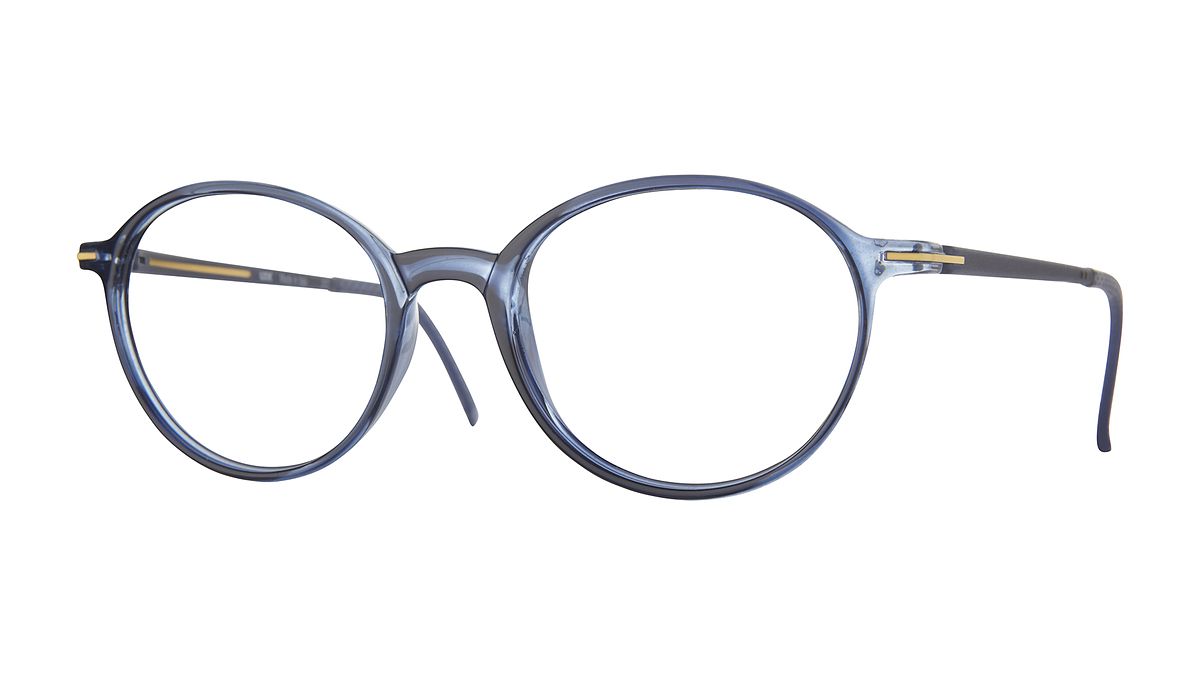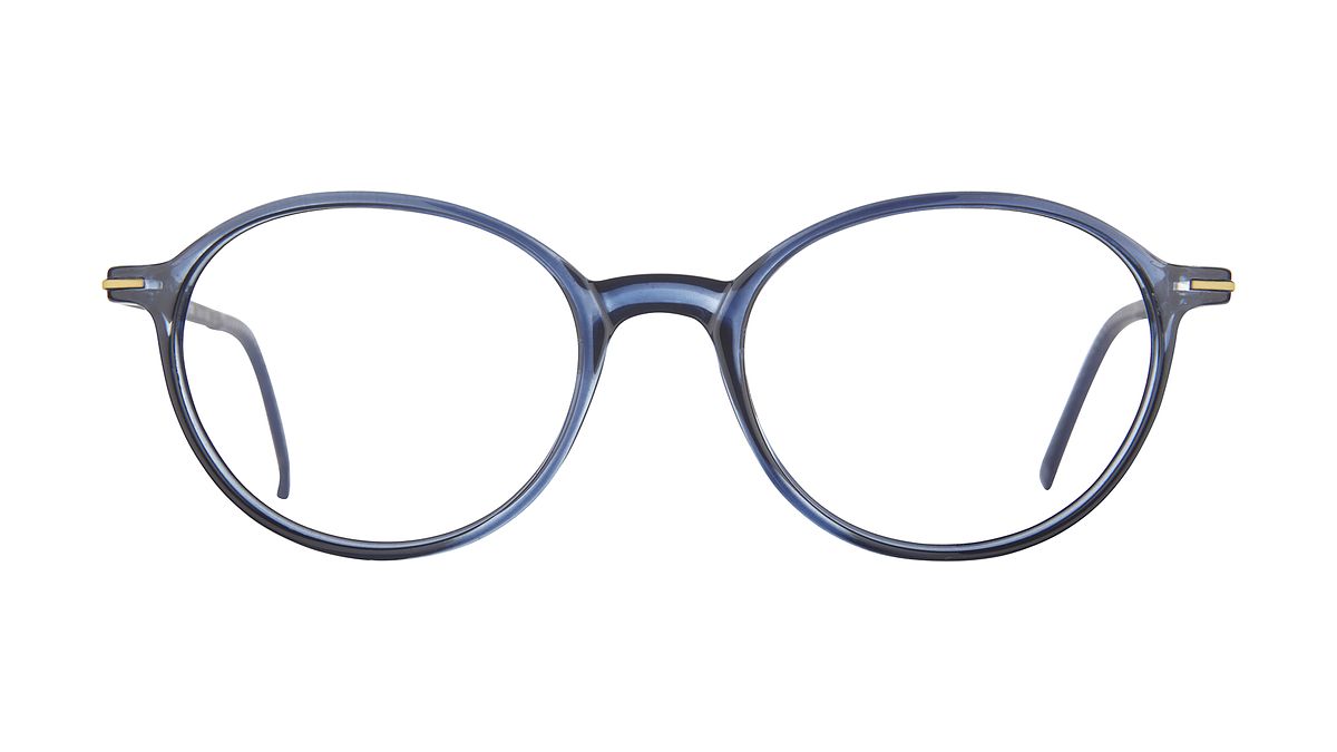 Colorazione W2 - Frontale blu trasparente lucido, aste blu con dettagli in smalto giallo pastello, terminali blu in abbinamento.