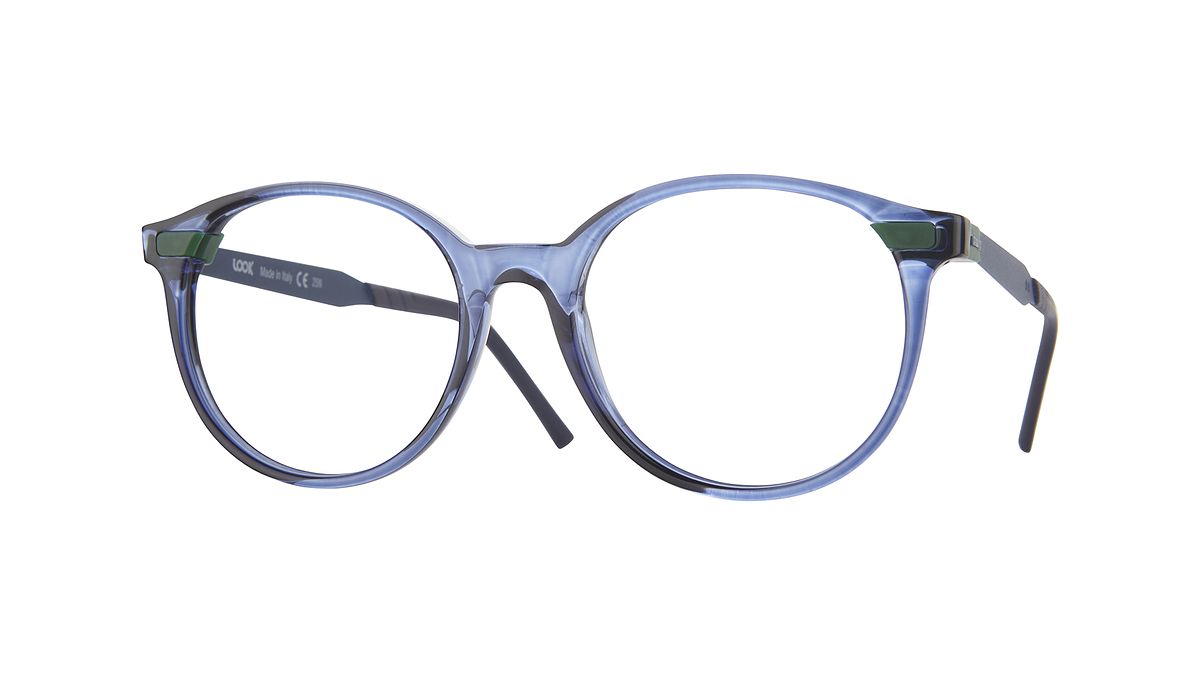 Colorazione C3 - Frontale blu trasparente lucido, aste blu opaco, musetti verdi e teminali in abbinamento.