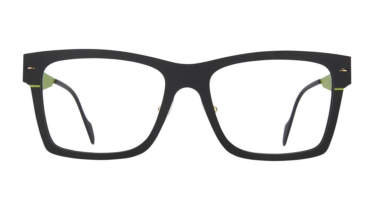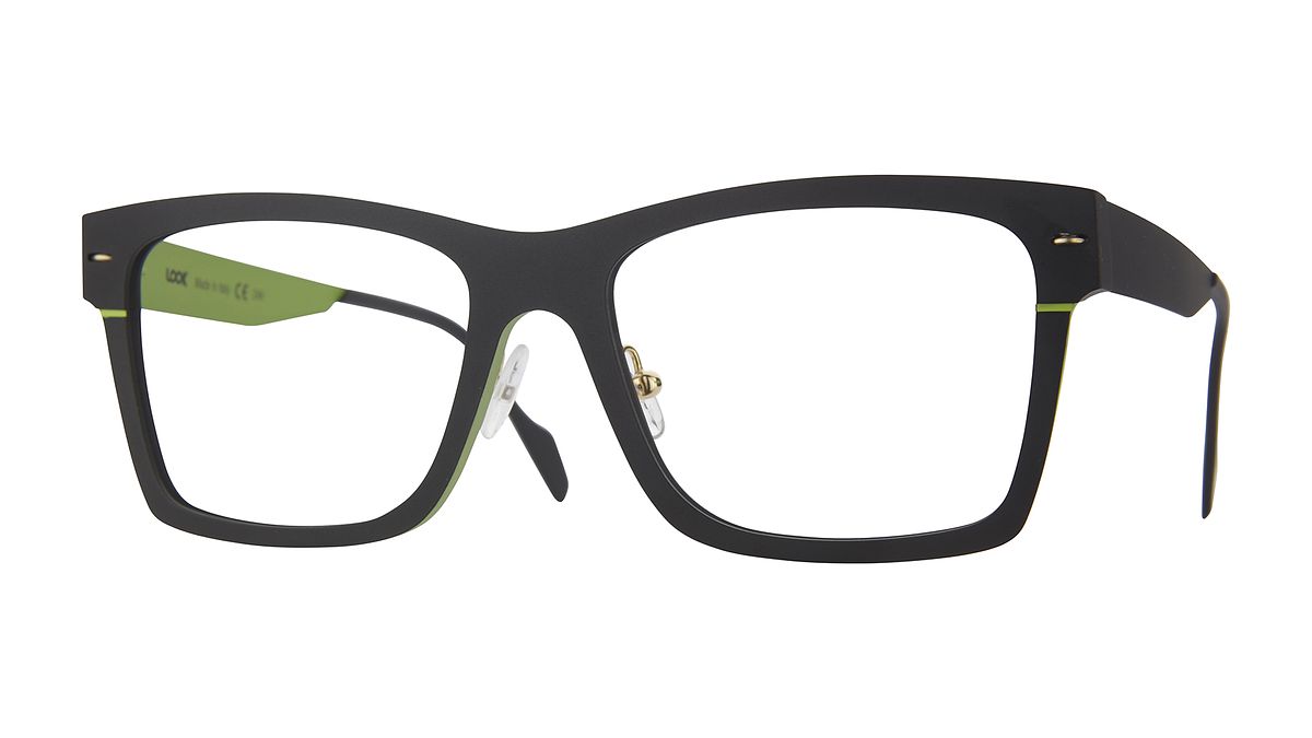 Colorazione M1 - Frontale nero opaco con spessore esterno e ribassi in verde lime. Aste nero opaco con interno verde lime.