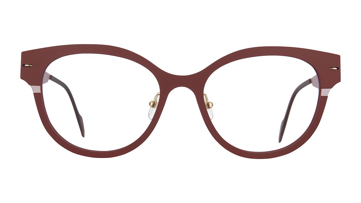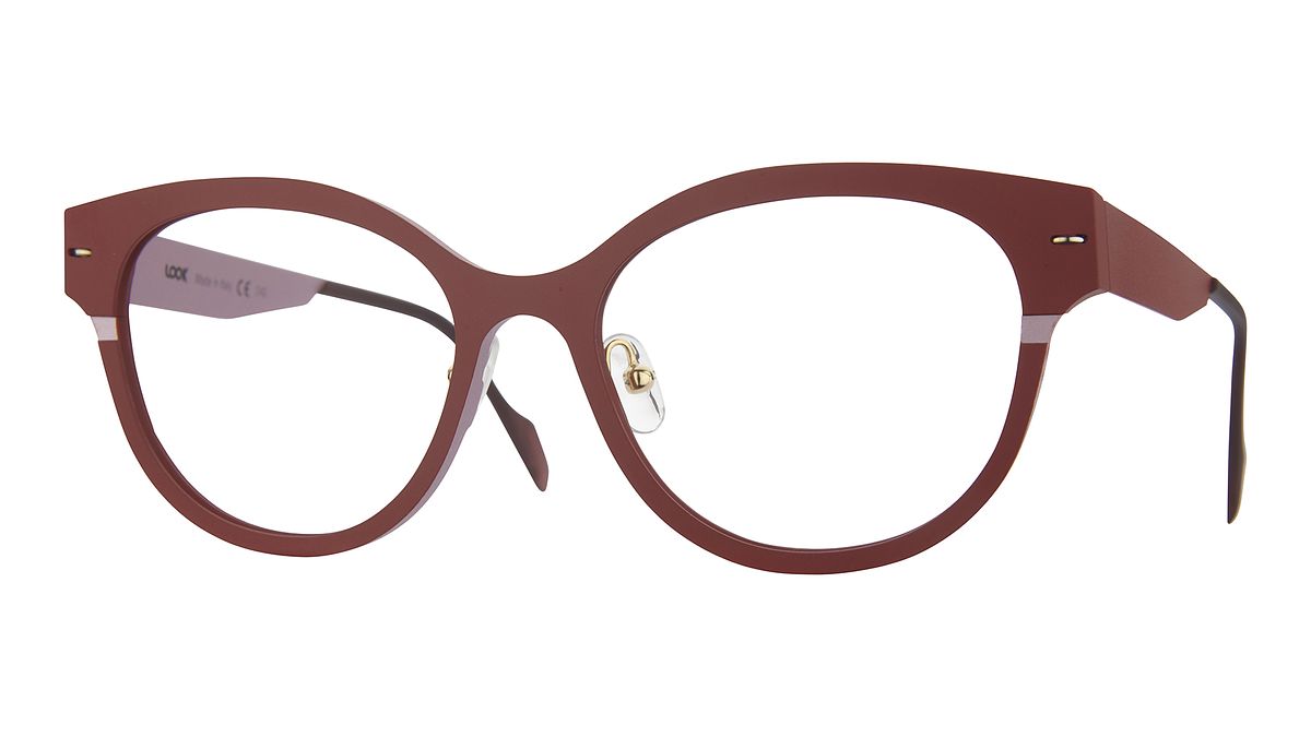 Colorazione M2 - Frontale rosso ciliegia opaco con spessore esterno e ribassi rosa chiaro. Aste rosso cigliegia opaco con interno rosa chiaro.