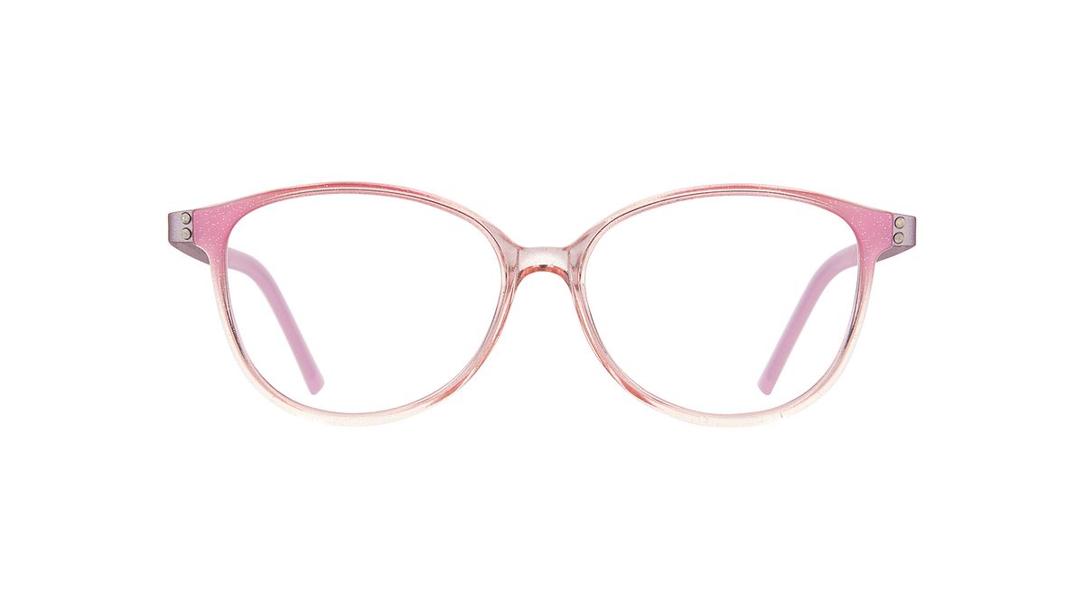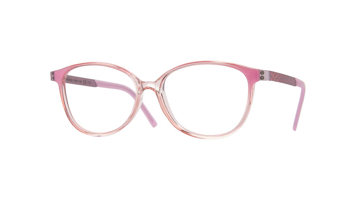 Colorazione W10 - Frontale rosa sfumato trasparente lucido con glitter argento. Aste rosa pervinca metallizzato arricchite da grafica touch-color a pois e terminali in abbinamento.