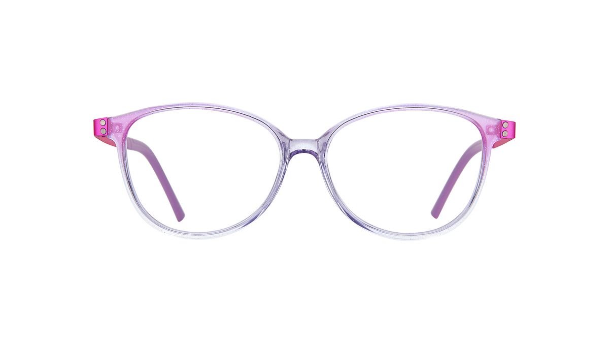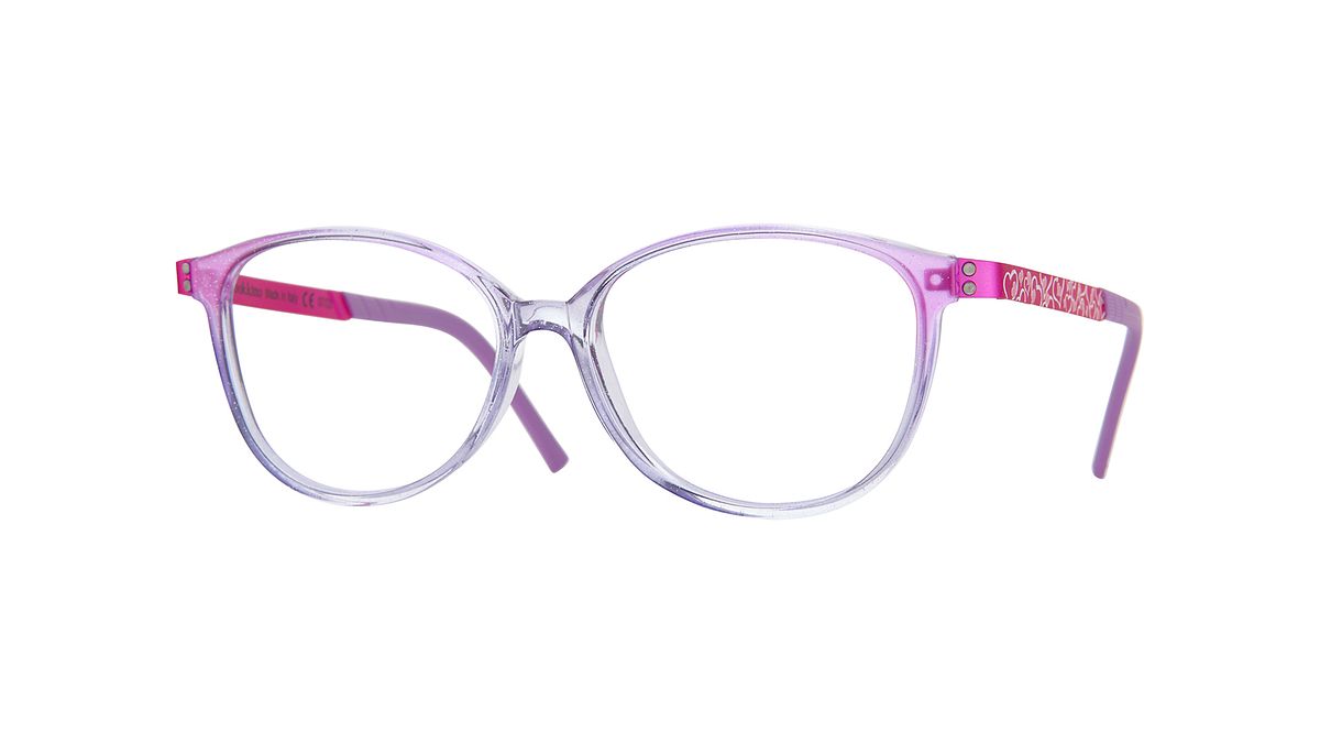 Colorazione W12 - Frontale fuxia trasparente sfumato viola trasparente con glitter argento. Aste fuxia fluo arricchite da grafica touch-color a cuori e terminali in abbinamento.