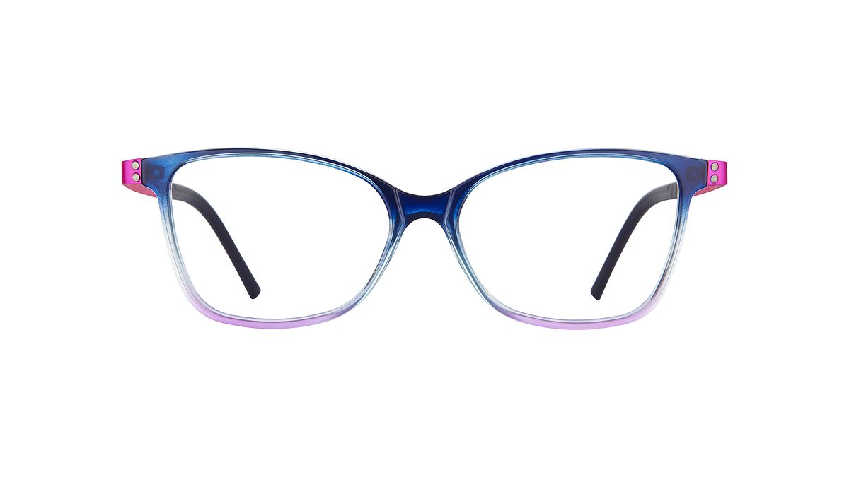 Colorazione W10 - Frontale blu notte sfumato fuxia scuro. Aste fuxia fluo metallizzato arricchite da grafica touch-color a cuori e terminali in abbinamento.